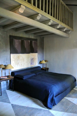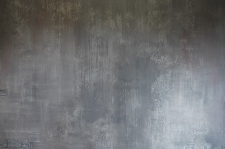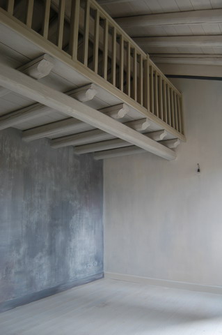 Alle pareti patine con colori sovrapposti, il pavimento in legno e’ dipinto a rombi