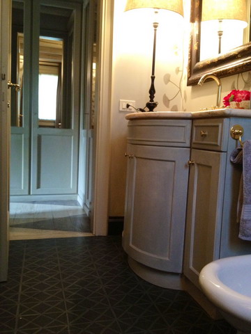 Nel bagno ramages alle pareti e pavimento in marmo dipinto con disegno geometrico giapponesi