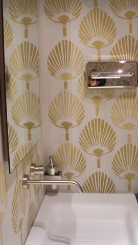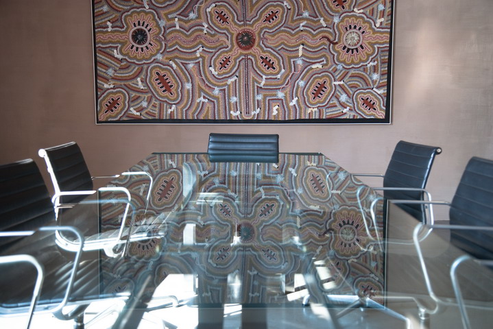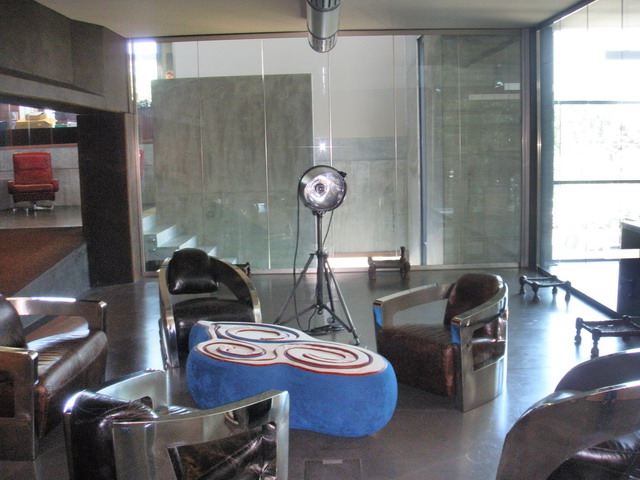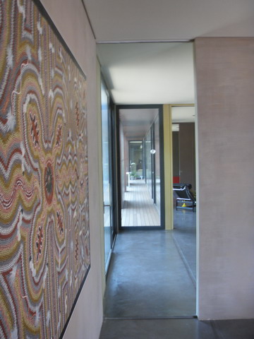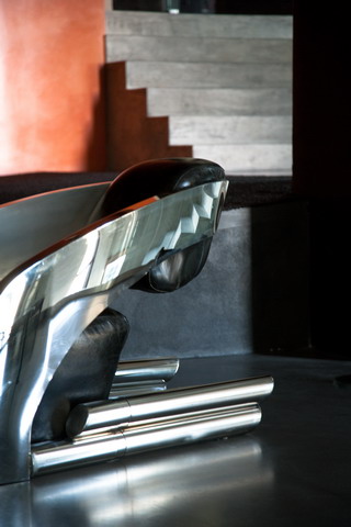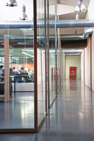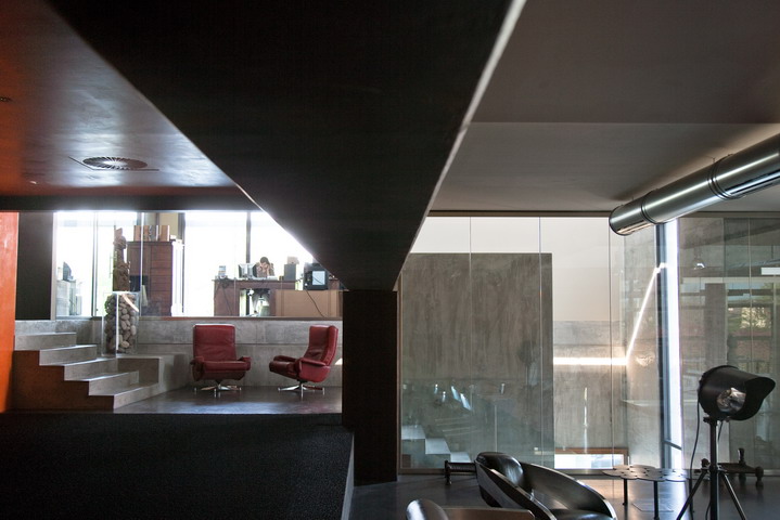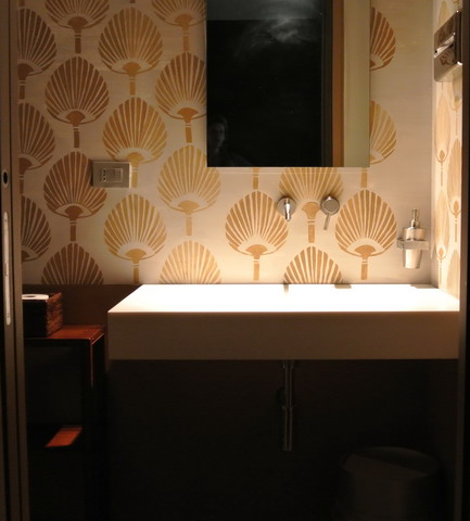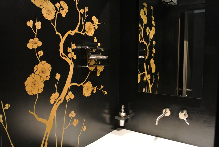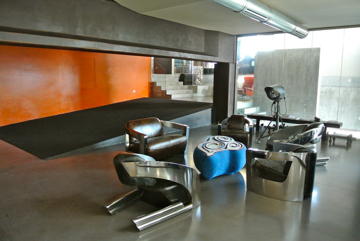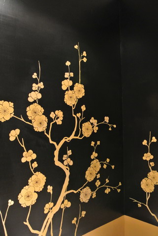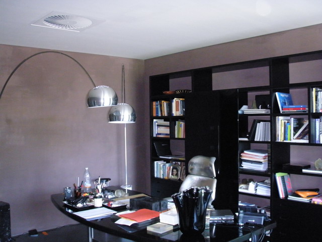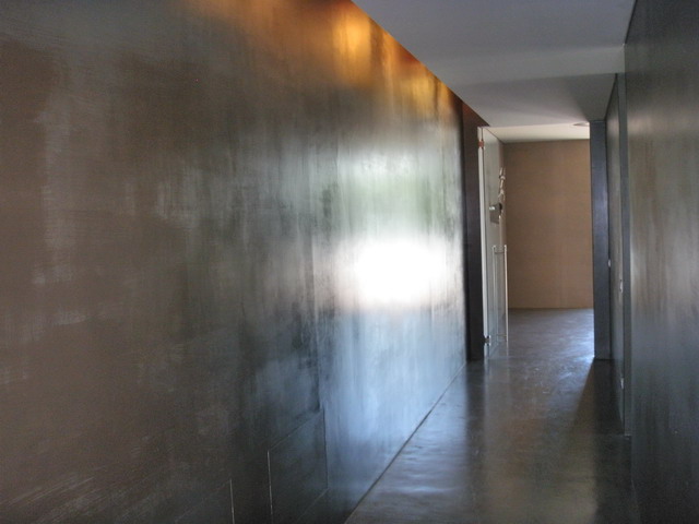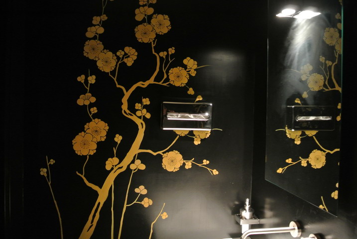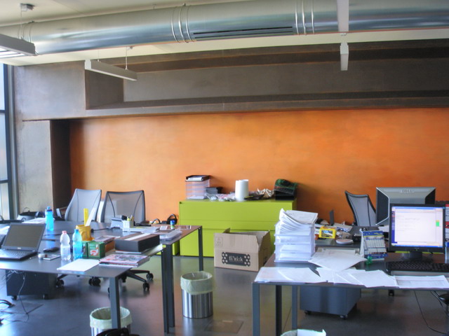 Al primo piano montanti in muratura dipinti con un effetto ferro ossidato, alle pareti patina arancione con toni di colore sovrapposti con finitura lucida. Nei corridoi patina materica con riflessi bronzei. Negli Uffici direzionali le pareti sono trattate a calce. Nei bagni decoro floreale di ispirazione giapponese dipinto a mano su lacca nera lucida.