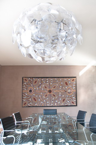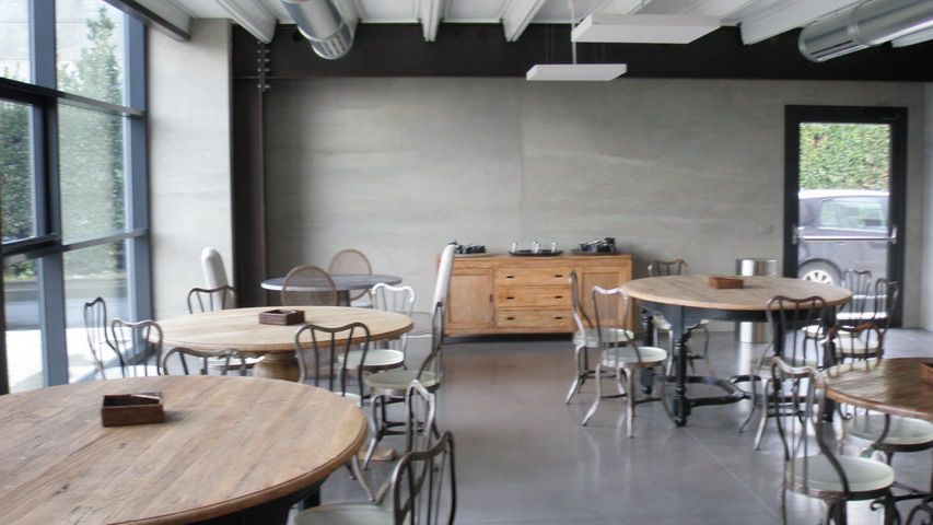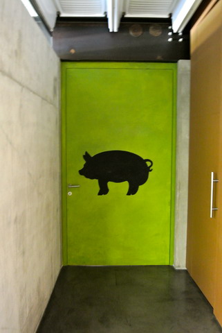 La porta che accede alla sala mensa con una silhouette e nella sala mensa pareti dipinte con un effetto cemento.